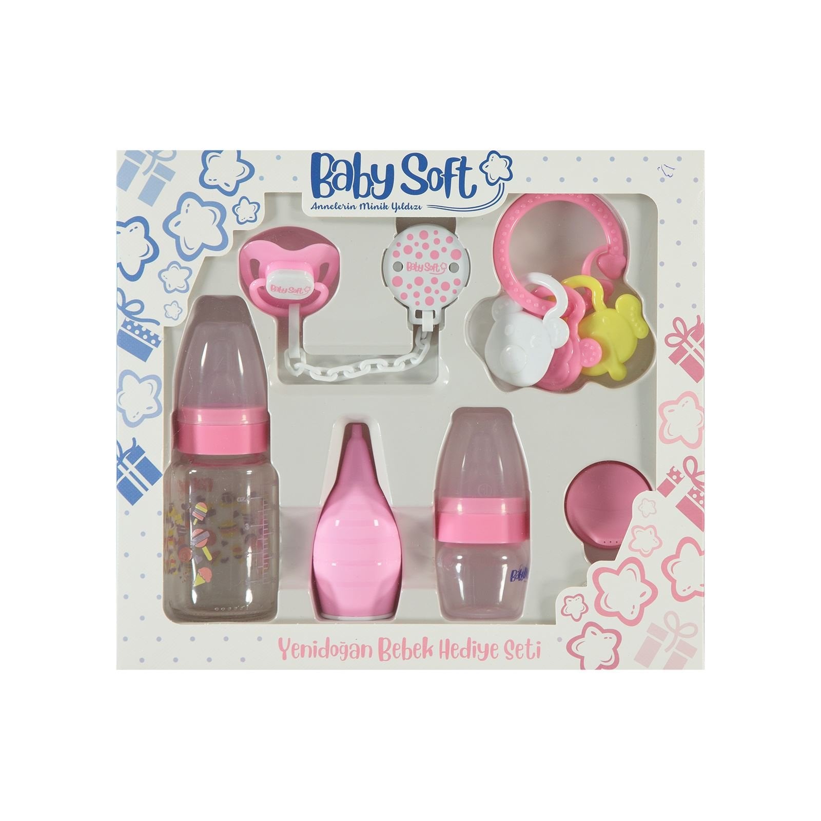 محتوى المنتج: \n زجاجة رضاعة 125 مل من البولي بروبيلين، \n مجموعة تدريب صغيرة (زجاجة وزجاجة ماء) \n مضخة أنف من السيليكون، \n حرية الحنك من السيليكون، شماعة \n جسمة، \n ، زجاج وشارب ليسا من الزجاجات.